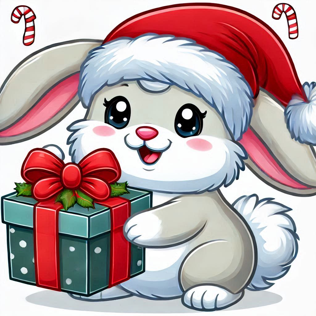 animal, bunny, candy canes, cartoon, celebration, character, cheer, christmas, cute, decoration, festive, fun, gift, holiday, jovial, joyful, present, santa hat, seasonal, winter
