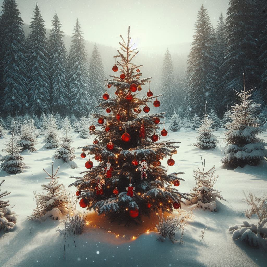 beauty, celebration, christmas tree, decorations, evergreen, festive, frost, holidays, landscape, light, nature, outdoor, pine trees, red ornaments, serenity, snowflakes, snowy forest, tranquility, winter, winter wonderland