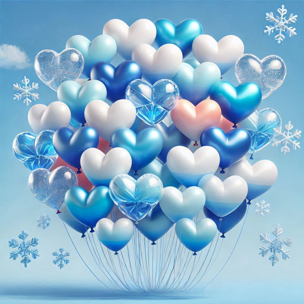 A cluster of heart-shaped balloons in shades of blue and white, surrounded by snowflakes against a clear blue sky, evokes a festive winter mood.