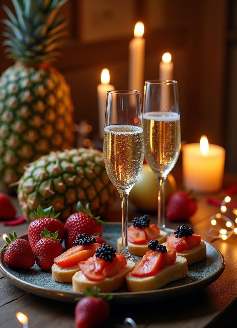 appetizers, candlelight, celebration, champagne, decorations, dining, evening, festive, flavorful, food, fruits, gathering, gourmet, party, pineapple, sparkling drinks, strawberries, sweetness, table, toast