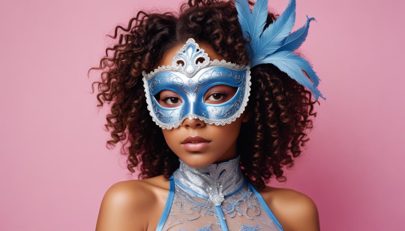 A woman with curly hair wears a glamorous blue mask, adorned with feathers, posing confidently against a soft pink background.