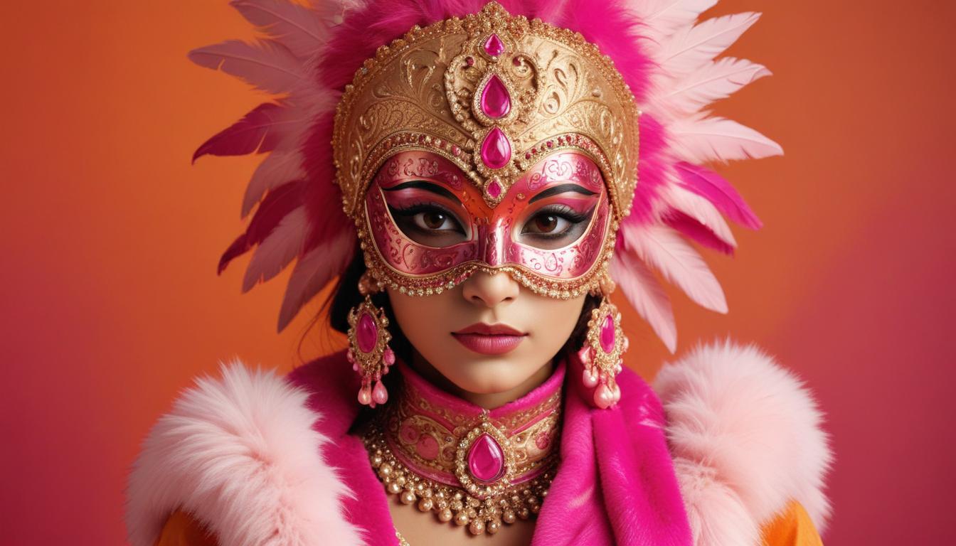 accessories, artistry, attire, beauty, bright, celebration, colorful, costume, cultural, decoration, design, fashion, feathers, festival, jewels, mask, masquerade, portrait, vibrant, woman