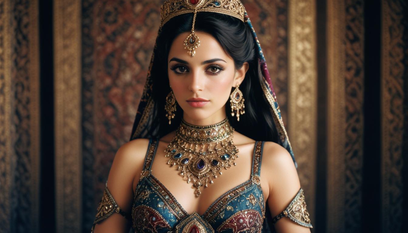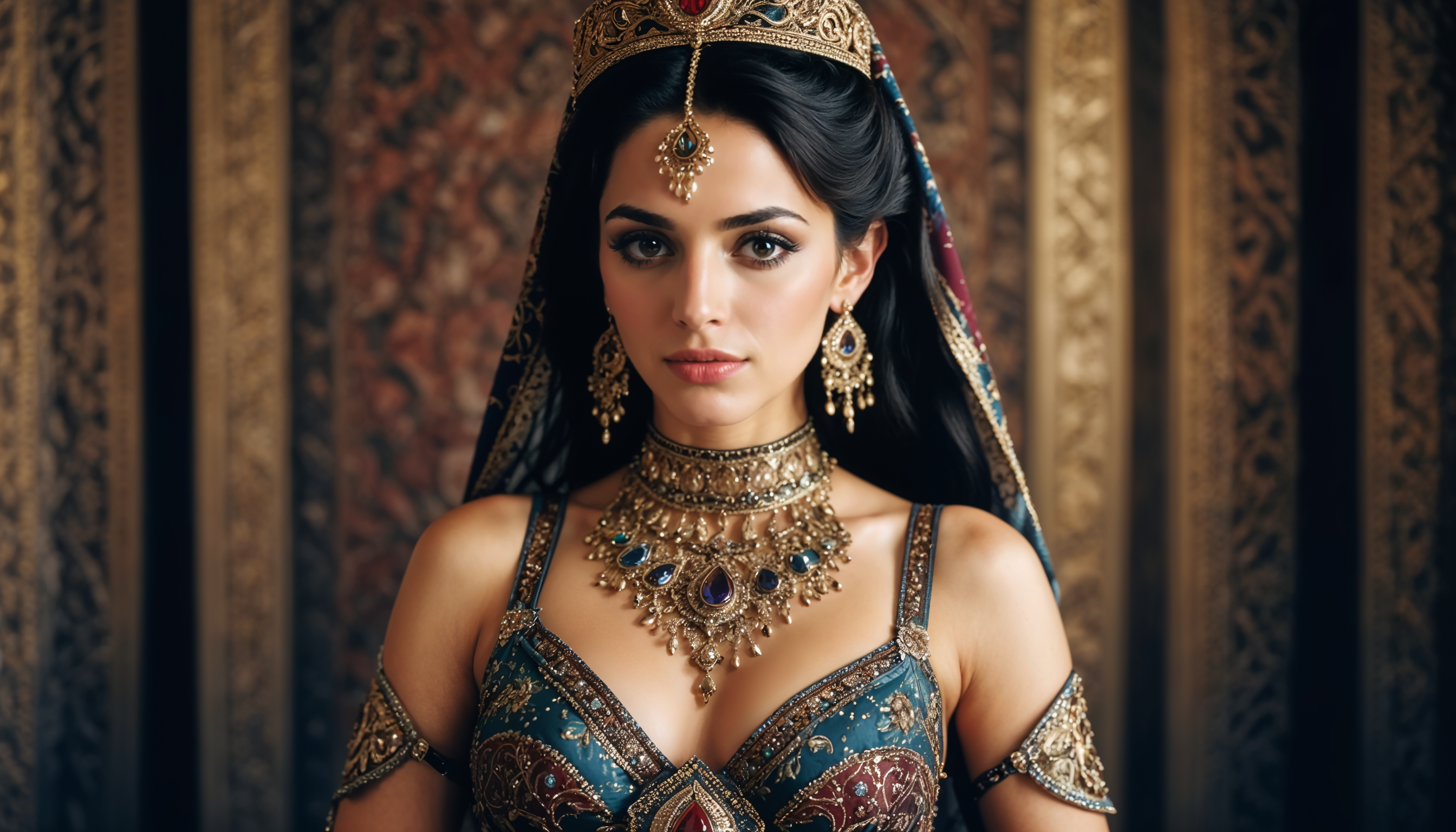 An elegant woman poses in beautifully detailed attire, showcasing ornate jewelry and a captivating background that highlights cultural artistry.