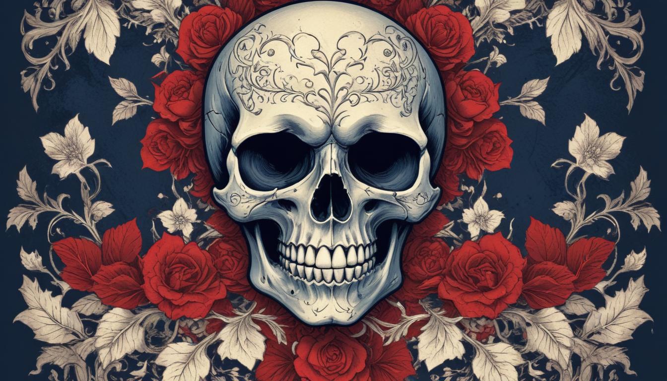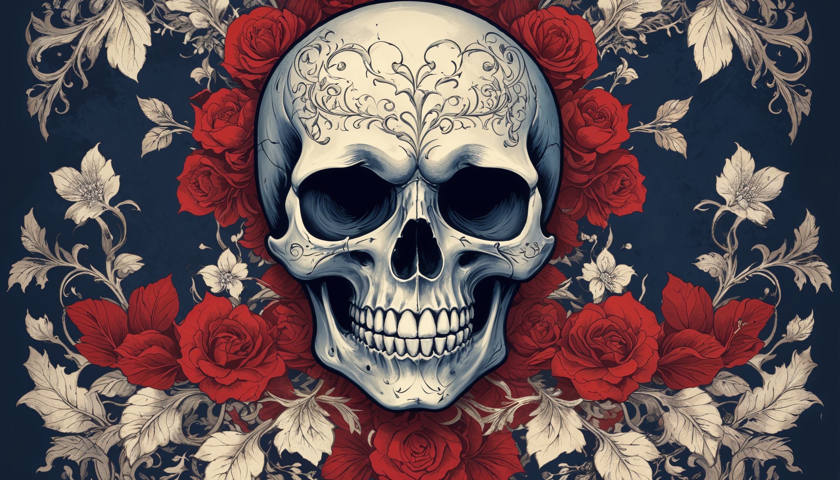 A detailed skull design is framed by vibrant red roses on a dark floral backdrop, showcasing intricate patterns and textures.