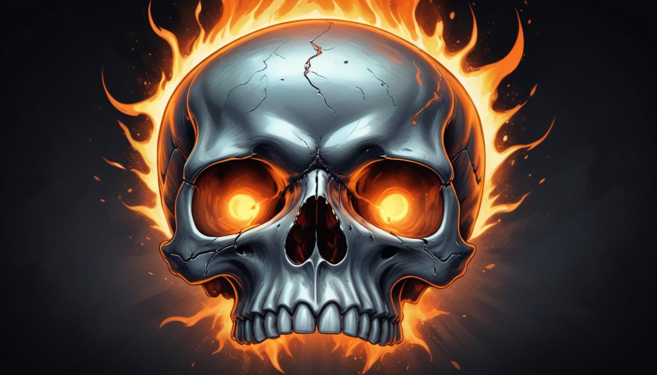 A metal skull with glowing orange eyes surrounded by flames, creating a dramatic and intense visual effect. The artwork showcases intricate details.