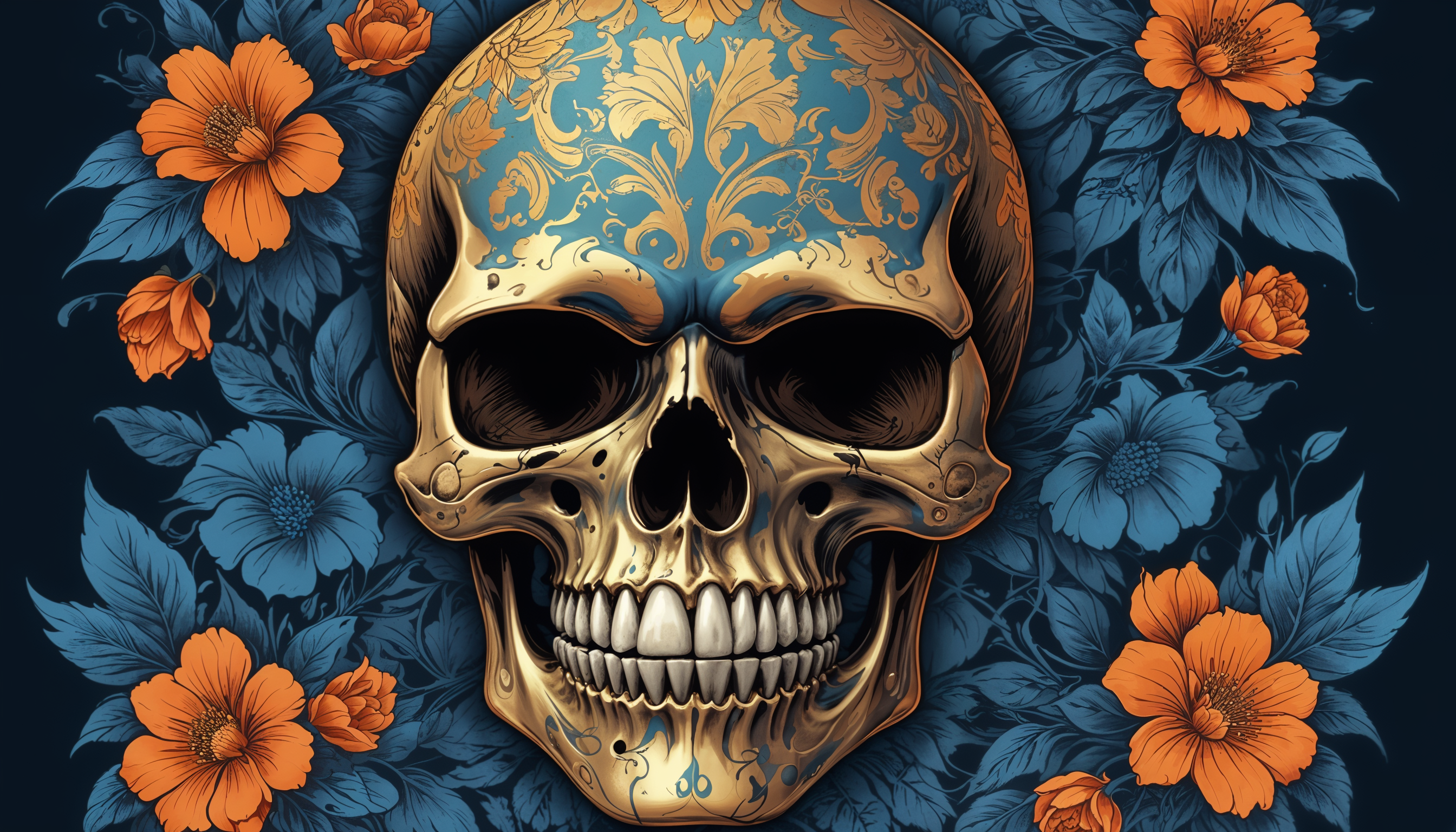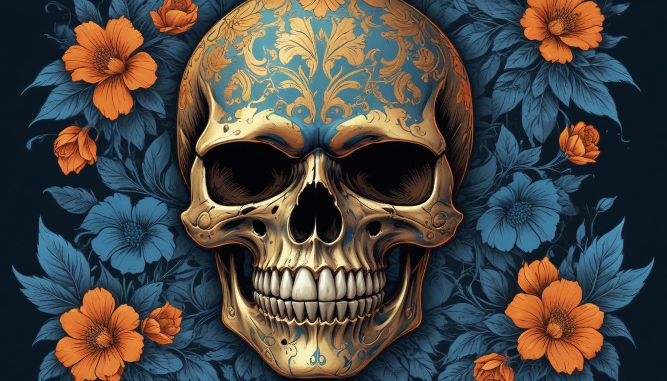 aesthetics, art, background, blue, celebration, colors, craftsmanship, creativity, decoration, detailed, floral design, flowers, illustration, nature, orange, pattern, skull, spooky, symbol, vibrant