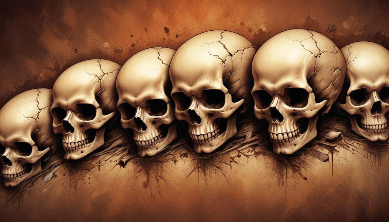 art, background, creative, decoration, design, detail, gothic, haunting, horror, human anatomy, illustration, lifelike, macabre, pattern, row, shadows, skulls, symmetry, texture, warm colors