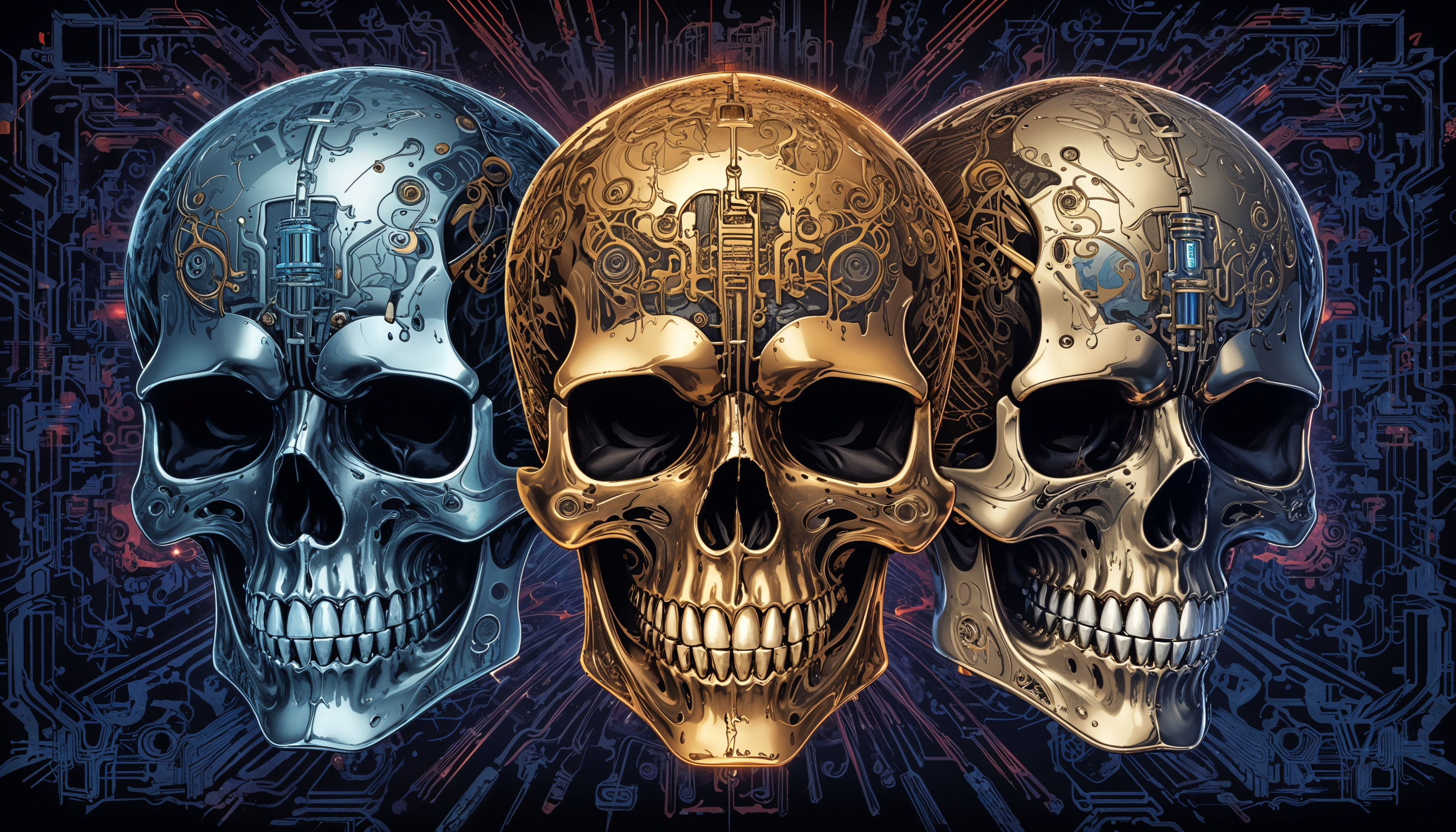 Three artistic skulls in blue, gold, and silver showcase detailed mechanical patterns against a dark, abstract background filled with circuitry.