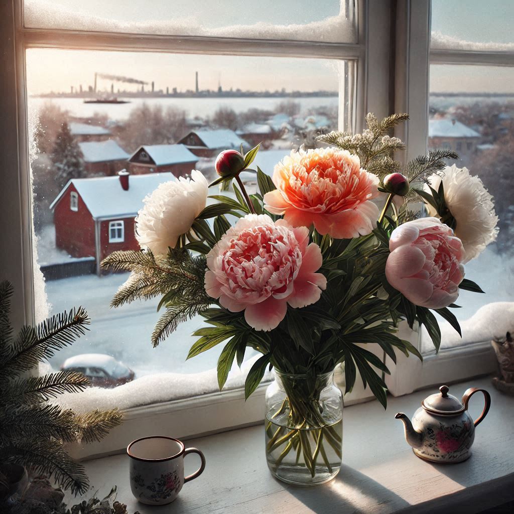 A vibrant bouquet of peonies is placed on a window sill, contrasting the snowy landscape and industrial city skyline outside.