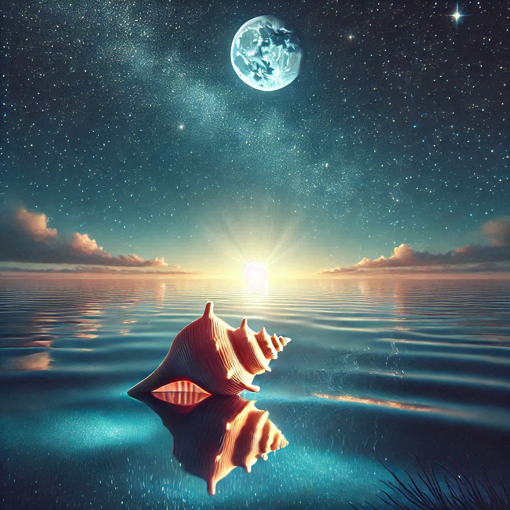 A large shell rests peacefully on calm water, reflecting the moonlight and stars, creating a serene atmosphere at dusk.