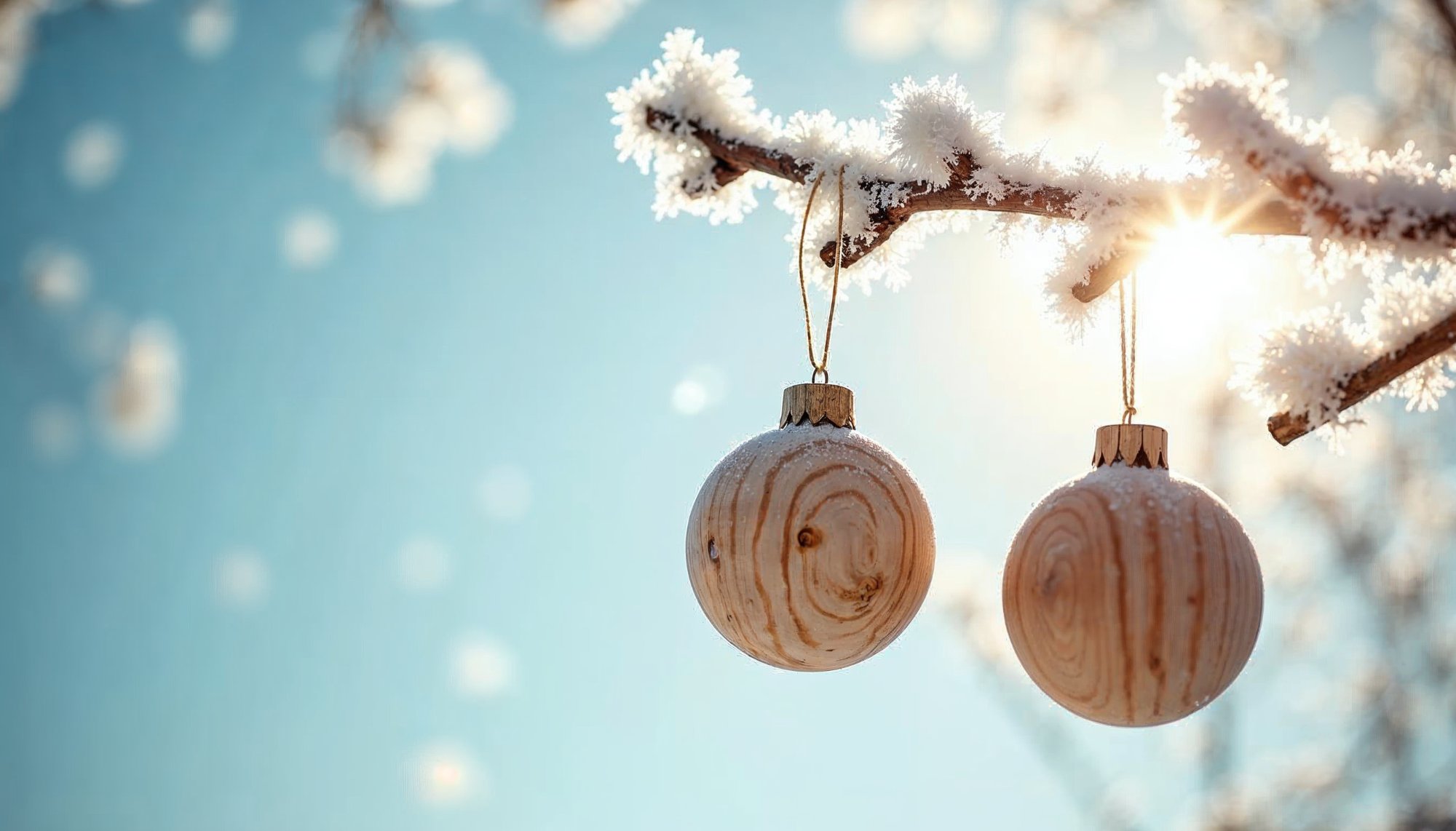 Two wooden ornaments dangle from a frosty branch against a clear winter sky, capturing the beauty of the season.