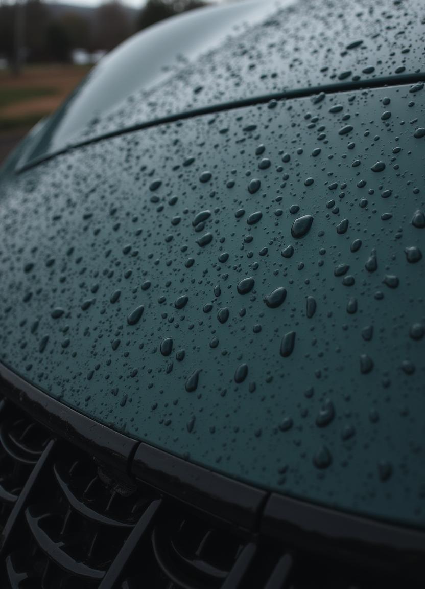 Water droplets accumulate on the shiny surface of a car, with a gray sky overhead creating a moody atmosphere and reflecting light.