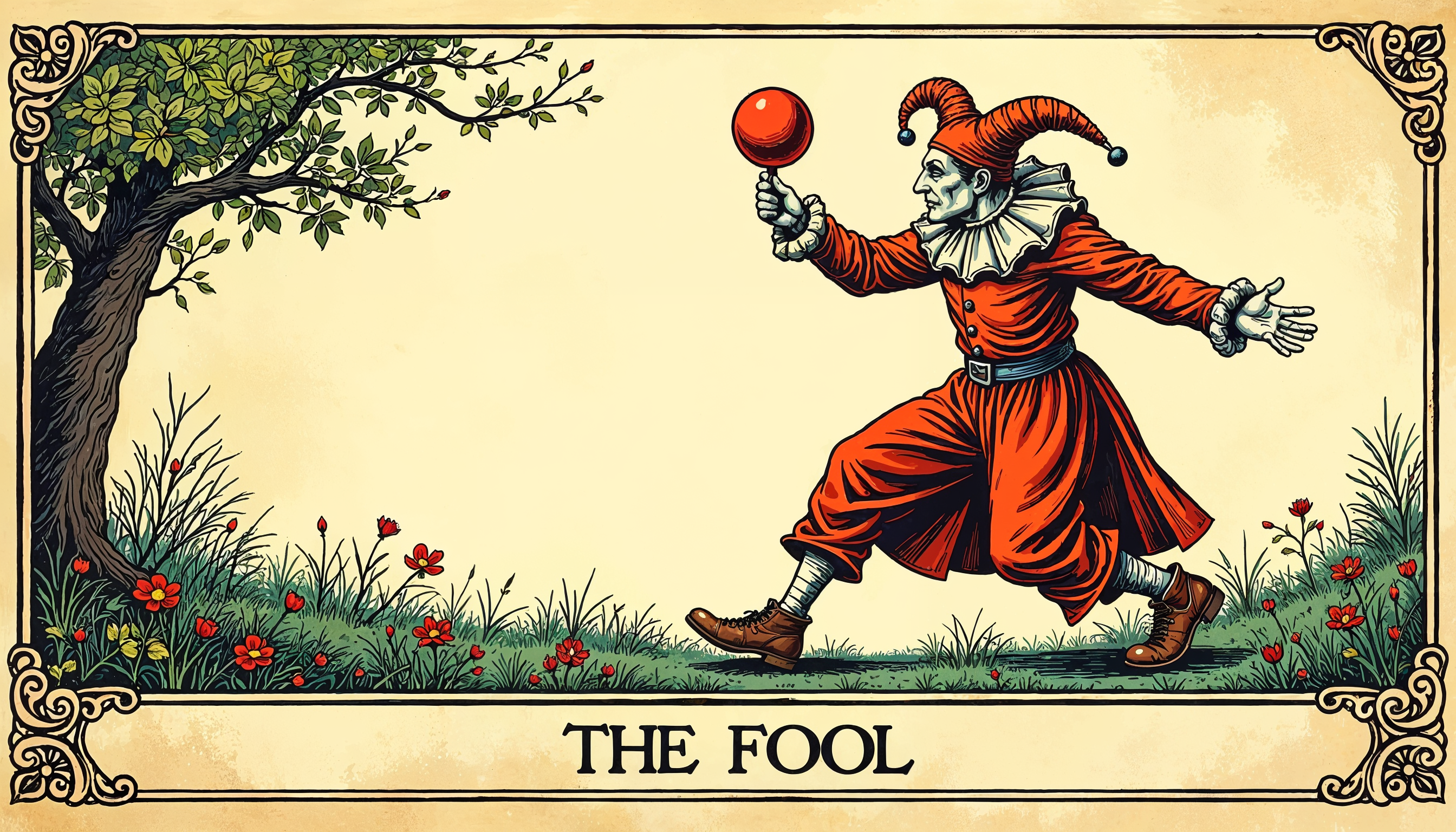 A colorful jester in bright attire strolls through a meadow filled with flowers, holding a red ball in his hand.