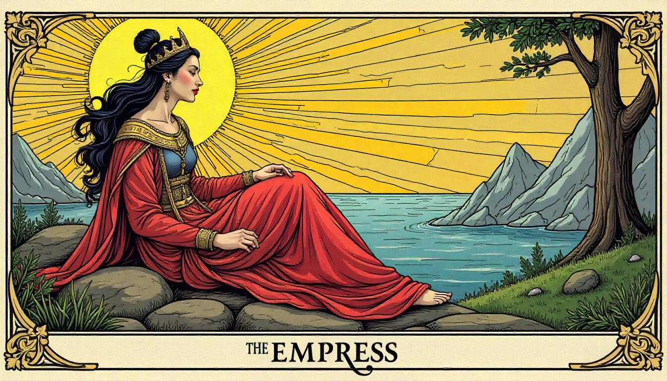 Empress seated beside tranquil waters at sunset