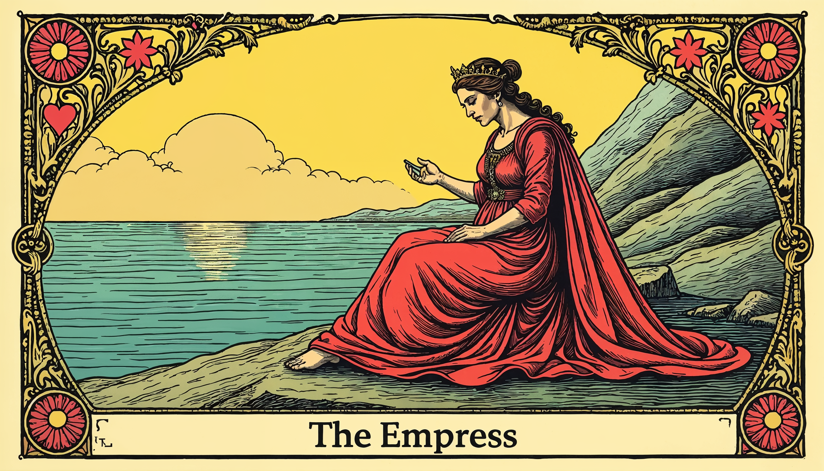 The Empress sits gracefully by the sea, dressed in a flowing red gown, gazing thoughtfully at the peacefully setting sun on the horizon.
