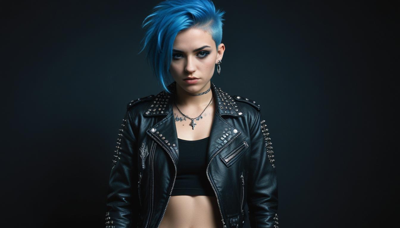 alternative fashion, attitude, blue hair, bold colors, confident pose, creativity, cropped top, dark background, edgy appearance, expressive look, fashion statement, hairstyle, individuality, leather jacket, lifestyle, portrait, punk style, rebellion, urban vibe, youth culture