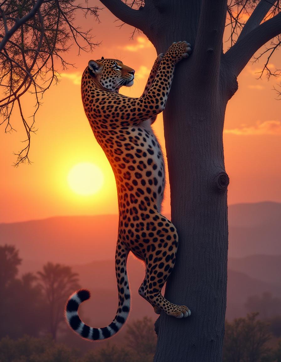 A leopard scales a tree against a stunning sunset backdrop in the savanna, showcasing its beautiful spots and agility.
