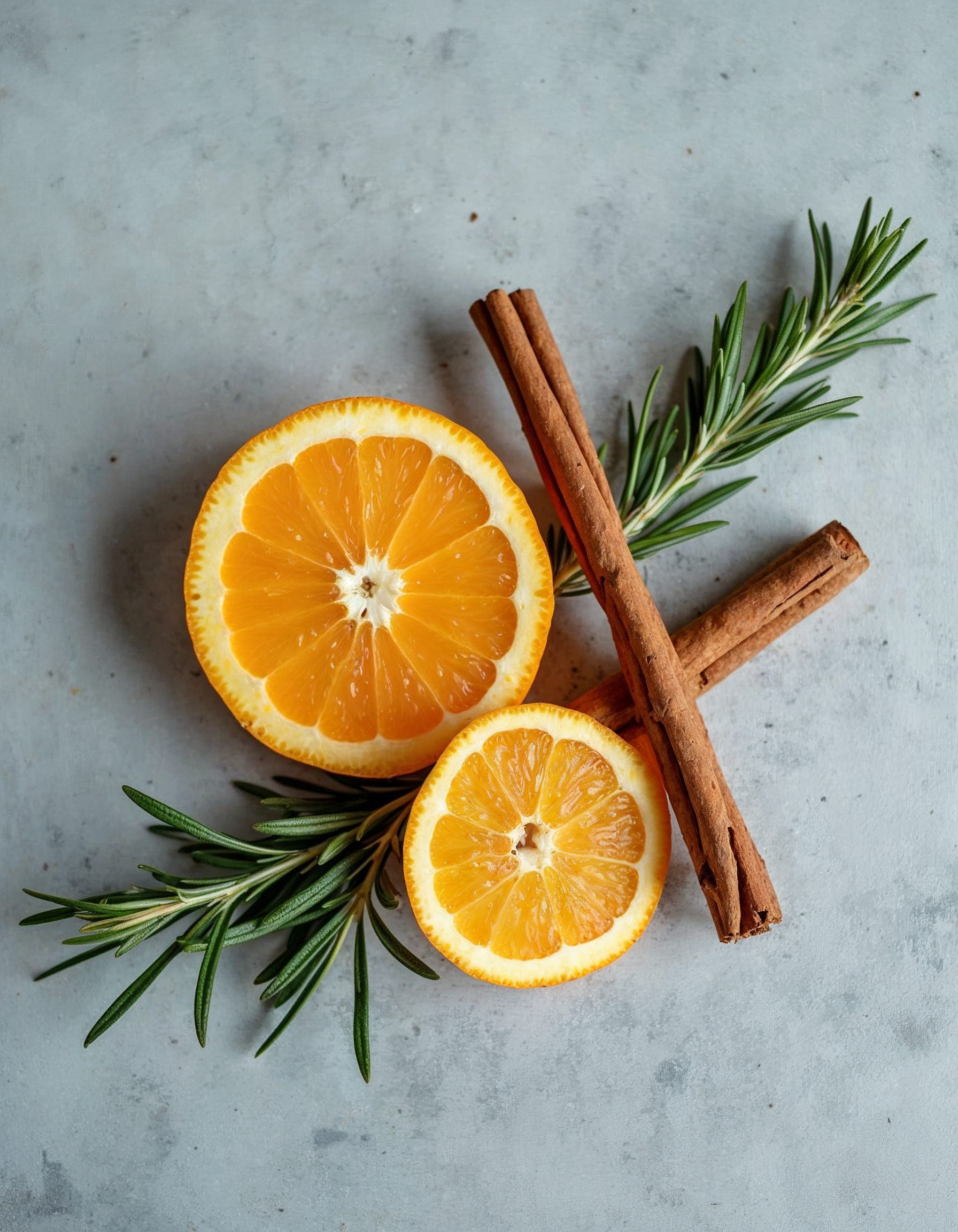 aroma, cinnamon, cooking, culinary, display, food, fresh, gray, healthy, herbs, ingredients, kitchen, natural, orange, recipe, rosemary, seasonal, slices, spice, vibrant