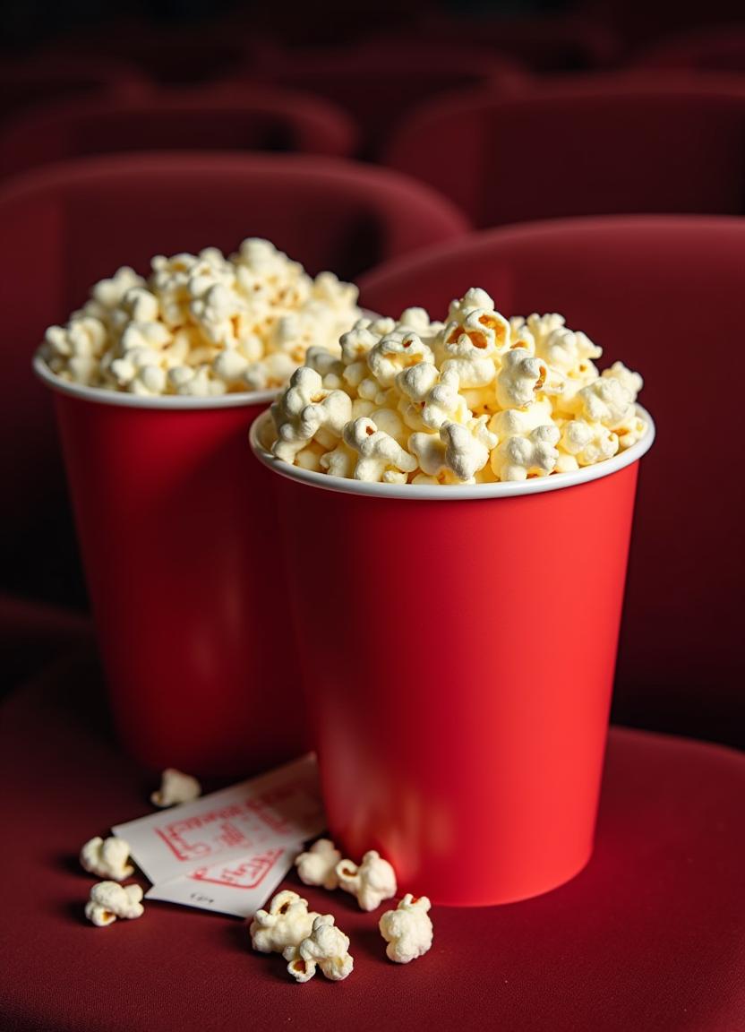 Two red cups filled with fluffy popcorn sit on plush red seats, ready for an enjoyable movie experience at the cinema.