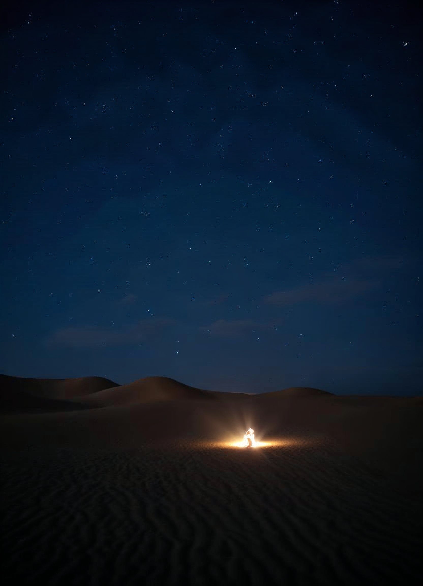 A person sits around a warm campfire in the desert, surrounded by sand dunes under a vast, starry night sky.