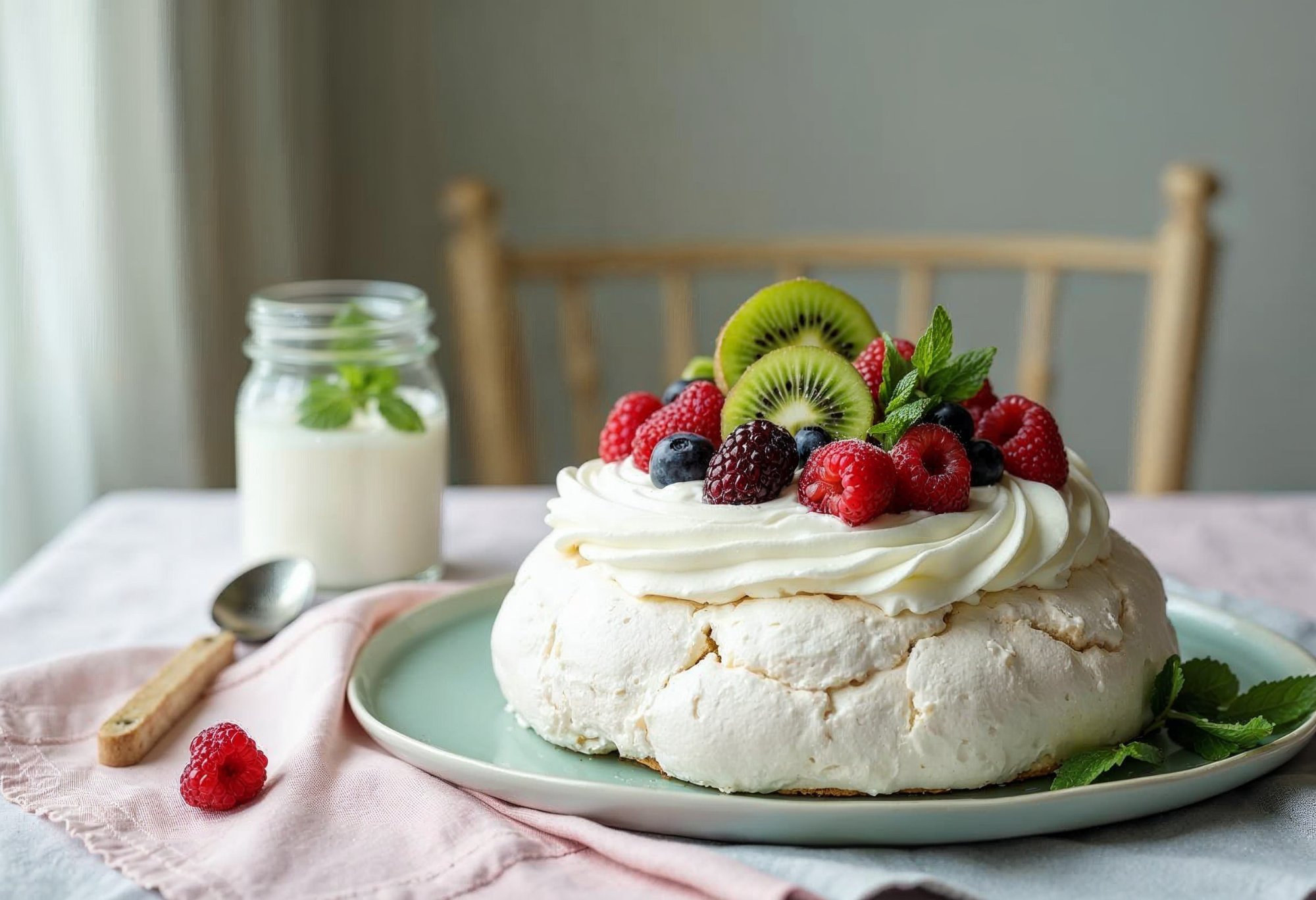 A beautifully crafted pavlova dessert sits on a table, adorned with fresh berries and kiwi, inviting a delightful taste experience.