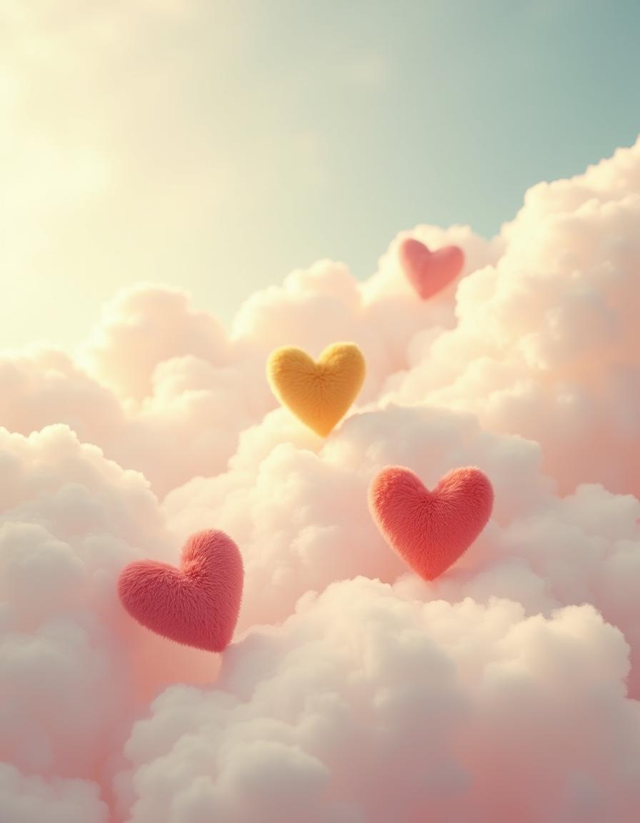 atmosphere, beauty, clouds, colorful, dreamy, emotional, floating, fluffy, hearts, love, nature, pastel, romance, scenery, sky, soft, sunset, sunshine, tranquility, whimsical