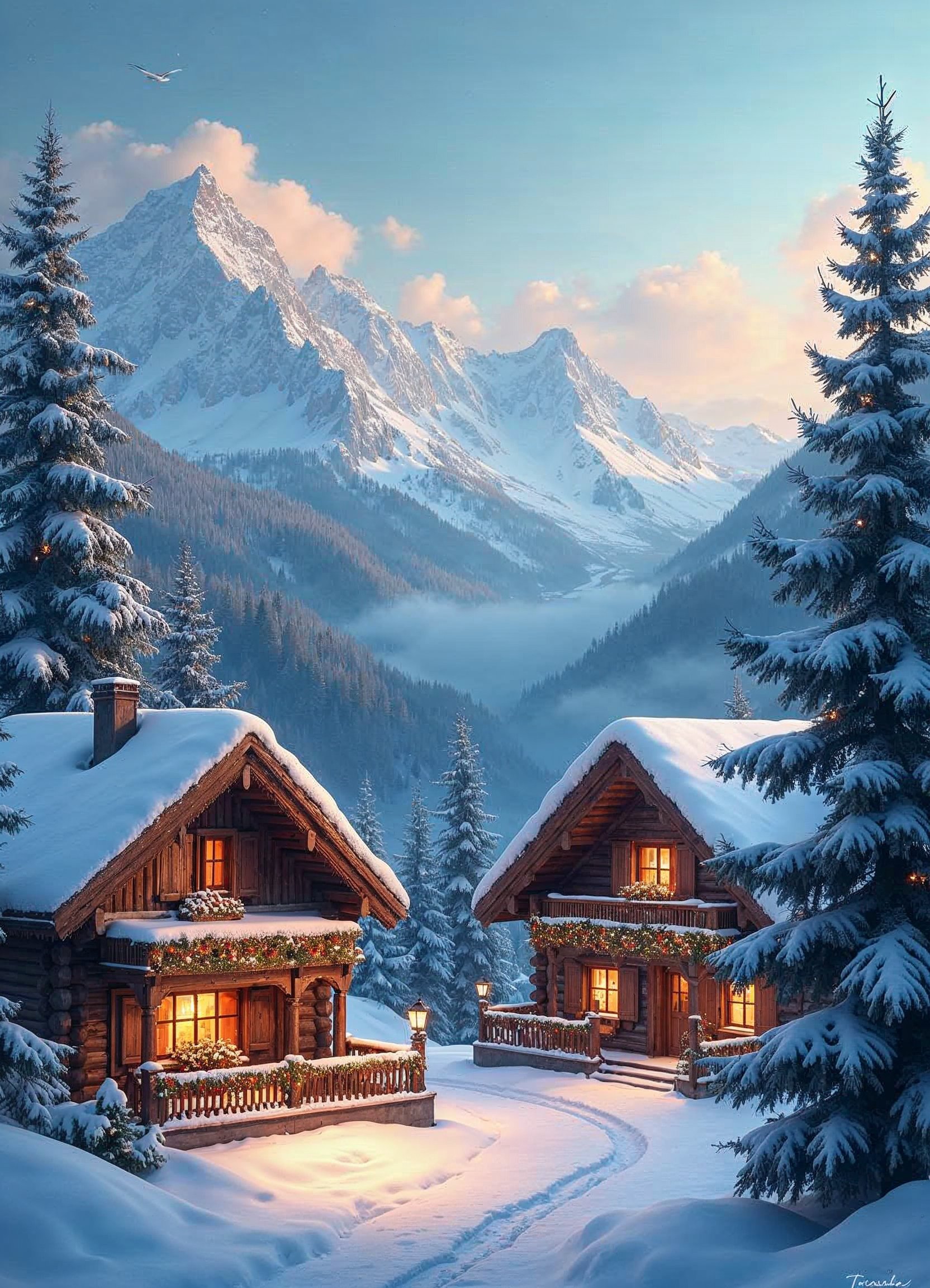 Two charming cabins sit amid a winter wonderland, with towering mountains in the background and snow blanketing the landscape at dusk.