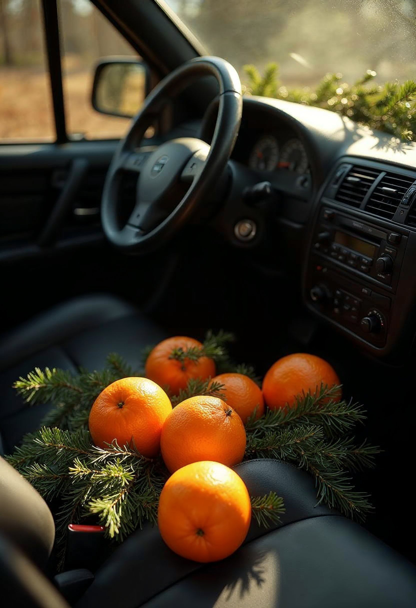car accessories, car interior, daylight, festive, fresh, fruits, greenery, greenery arrangement, holiday decor, interior design, natural elements, nature, oranges, seasonal, seat decoration, simplicity, sunlight, transportation, vibrant colors, warmth