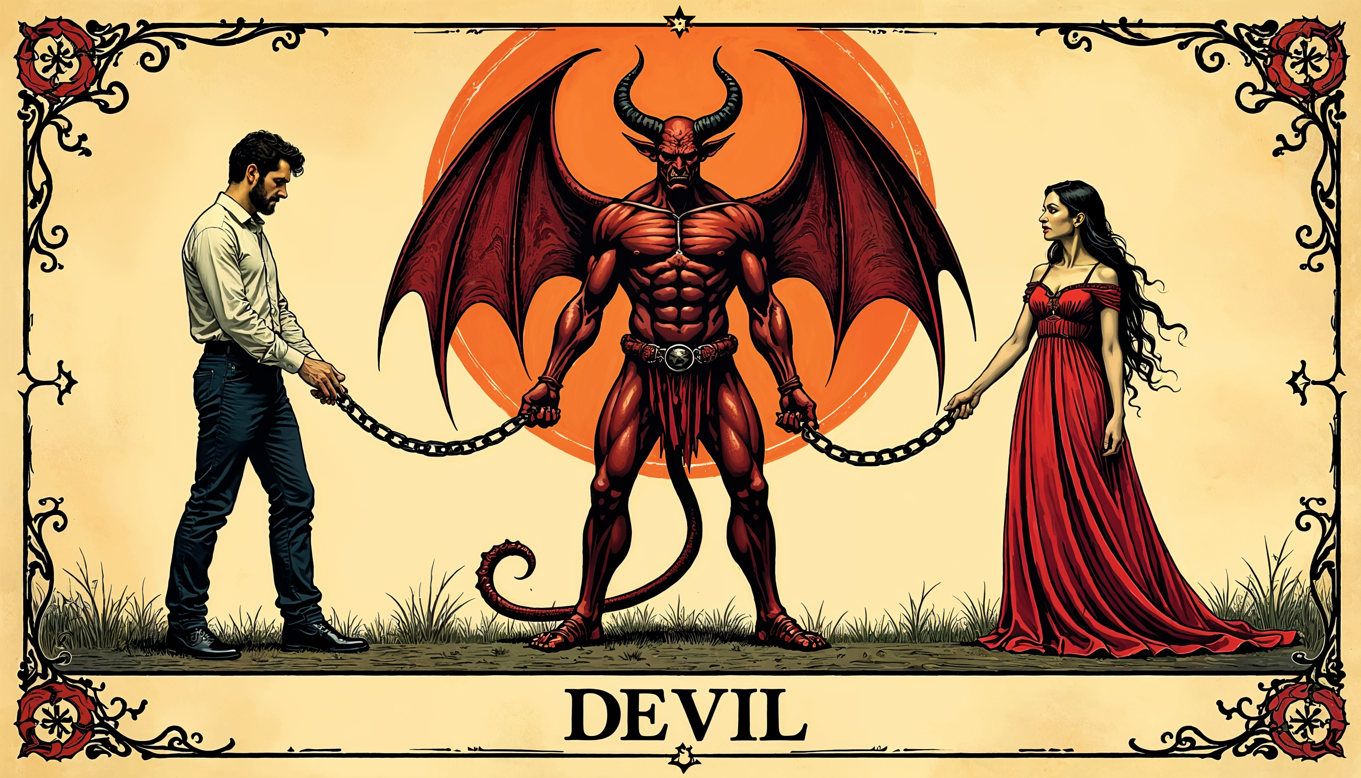 artwork, chains, contrast, dark, devil, emotions, fantasy, figures, horror, illustration, man, mythology, power, red, relationship, struggle, symbolism, temptation, wings, woman