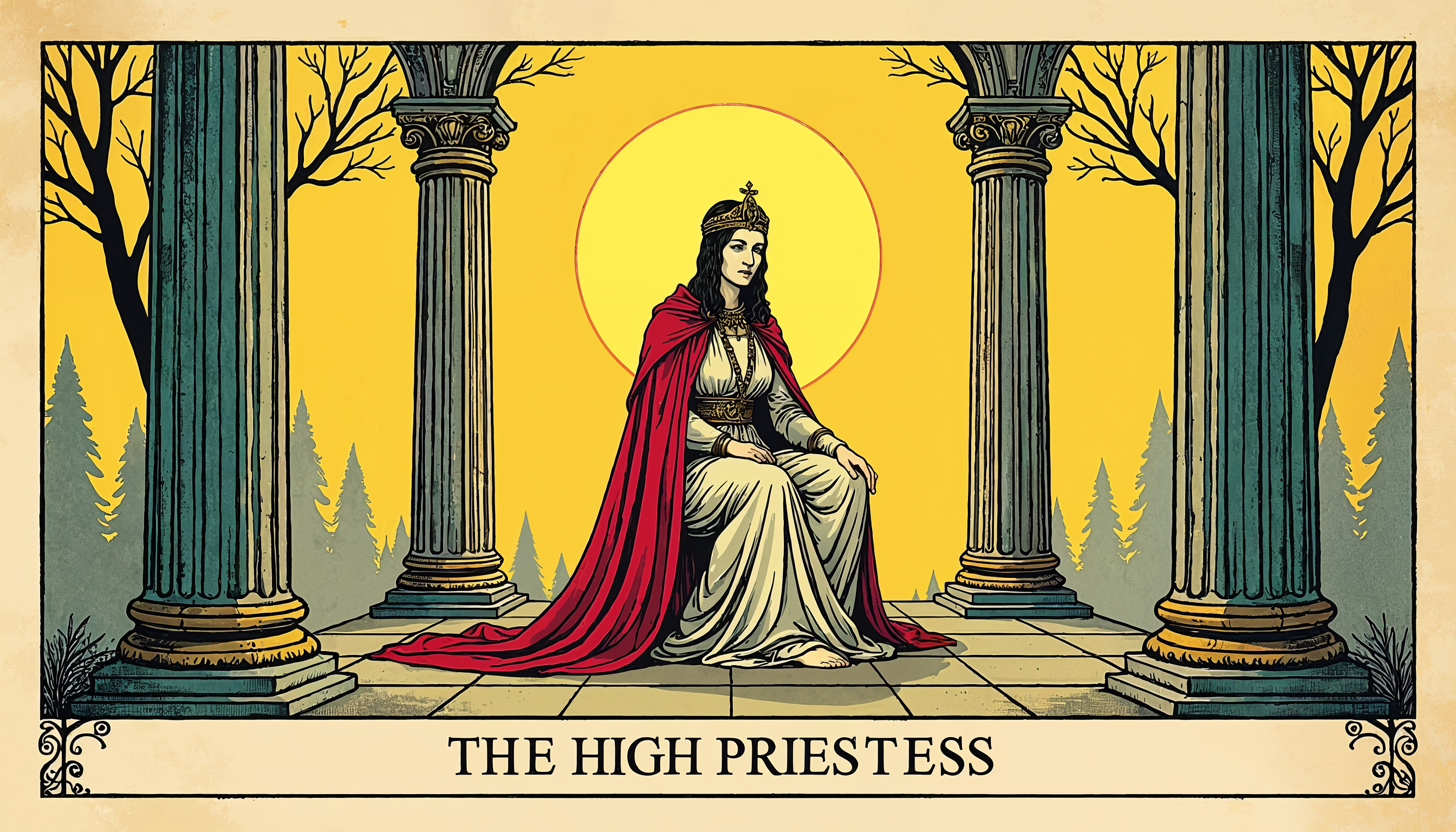ancient art, ancient columns, archetype, divination, divine feminine, elegant pose, forest backdrop, goddess, high priestess, intuition, mystery, mystical setting, red cloak, sacred space, seated figure, serenity, spirituality, symbolism, tarot card, wisdom