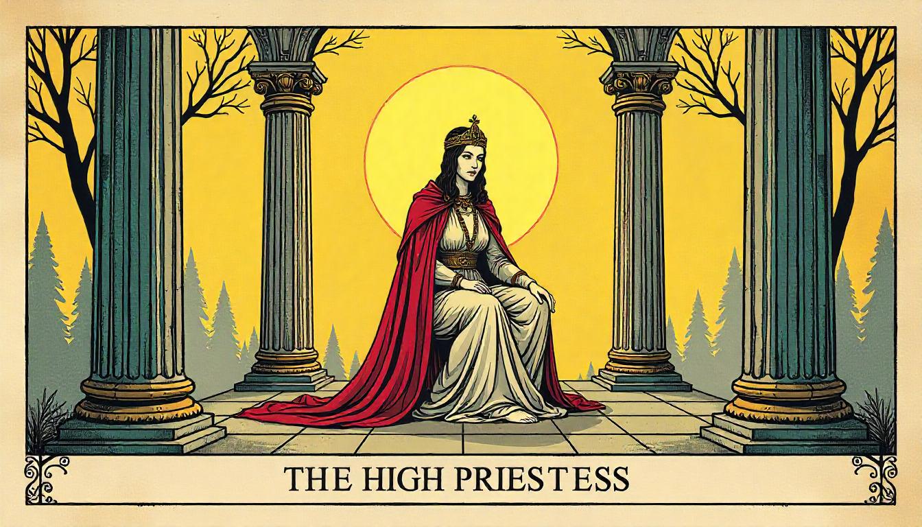 A figure representing the High Priestess sits gracefully between ancient columns, surrounded by a serene forest backdrop symbolizing intuition.
