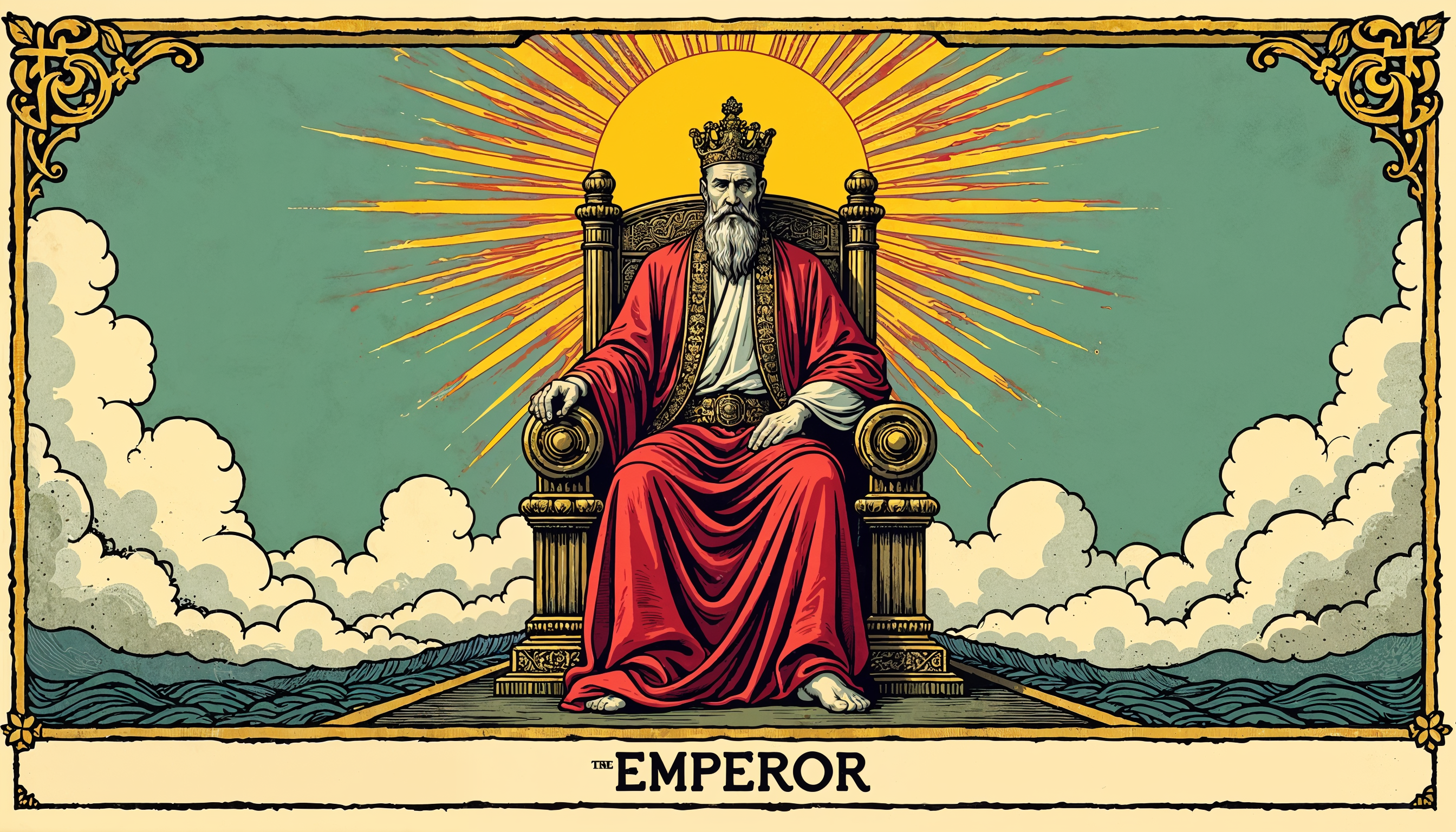 A regal emperor sits on a grand throne, dressed in ornate robes, surrounded by a vibrant sunburst and clouds, symbolizing power and authority.