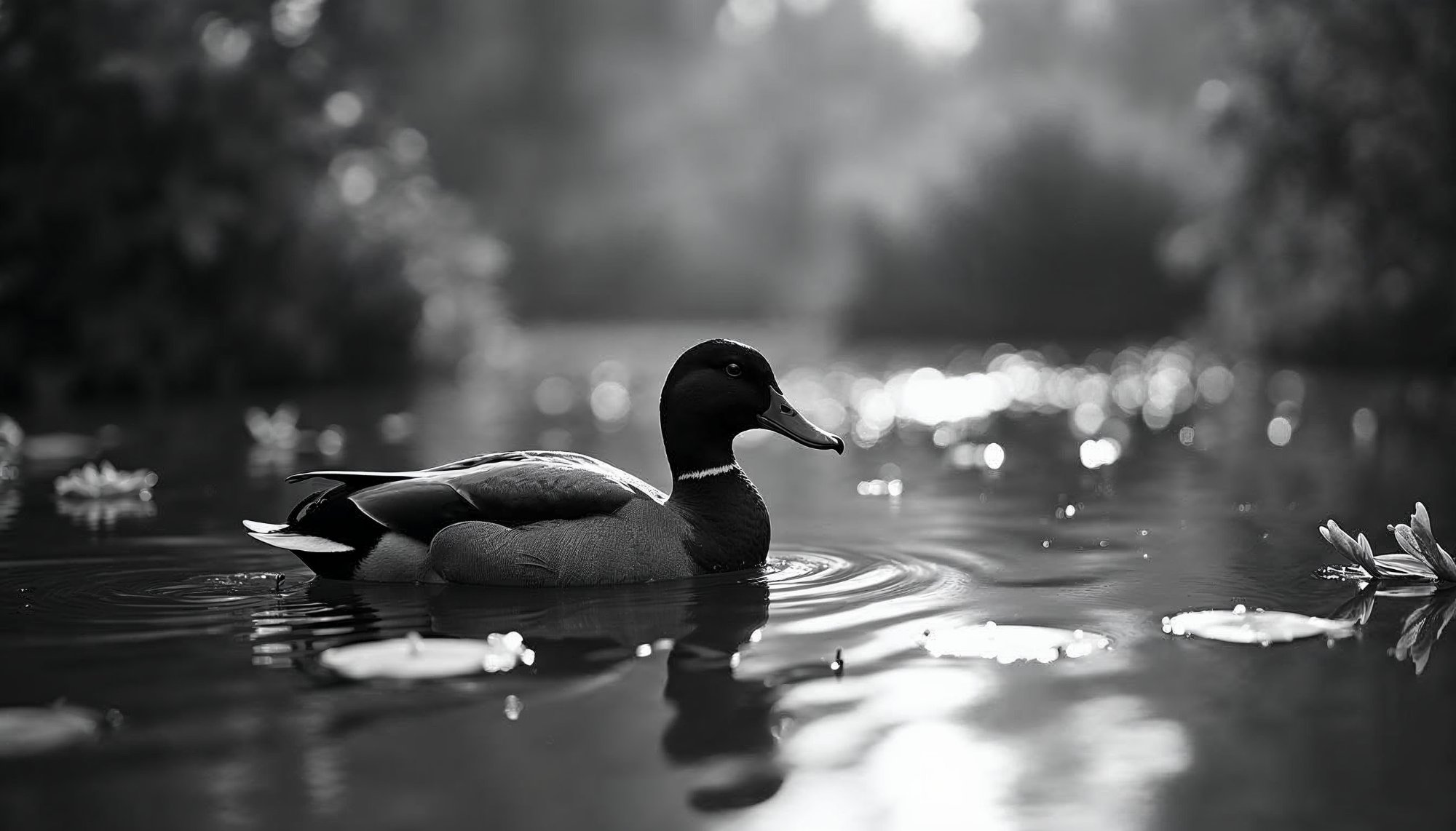 A solitary duck glides through a tranquil pond surrounded by lily pads, capturing the serenity of nature in monochrome.