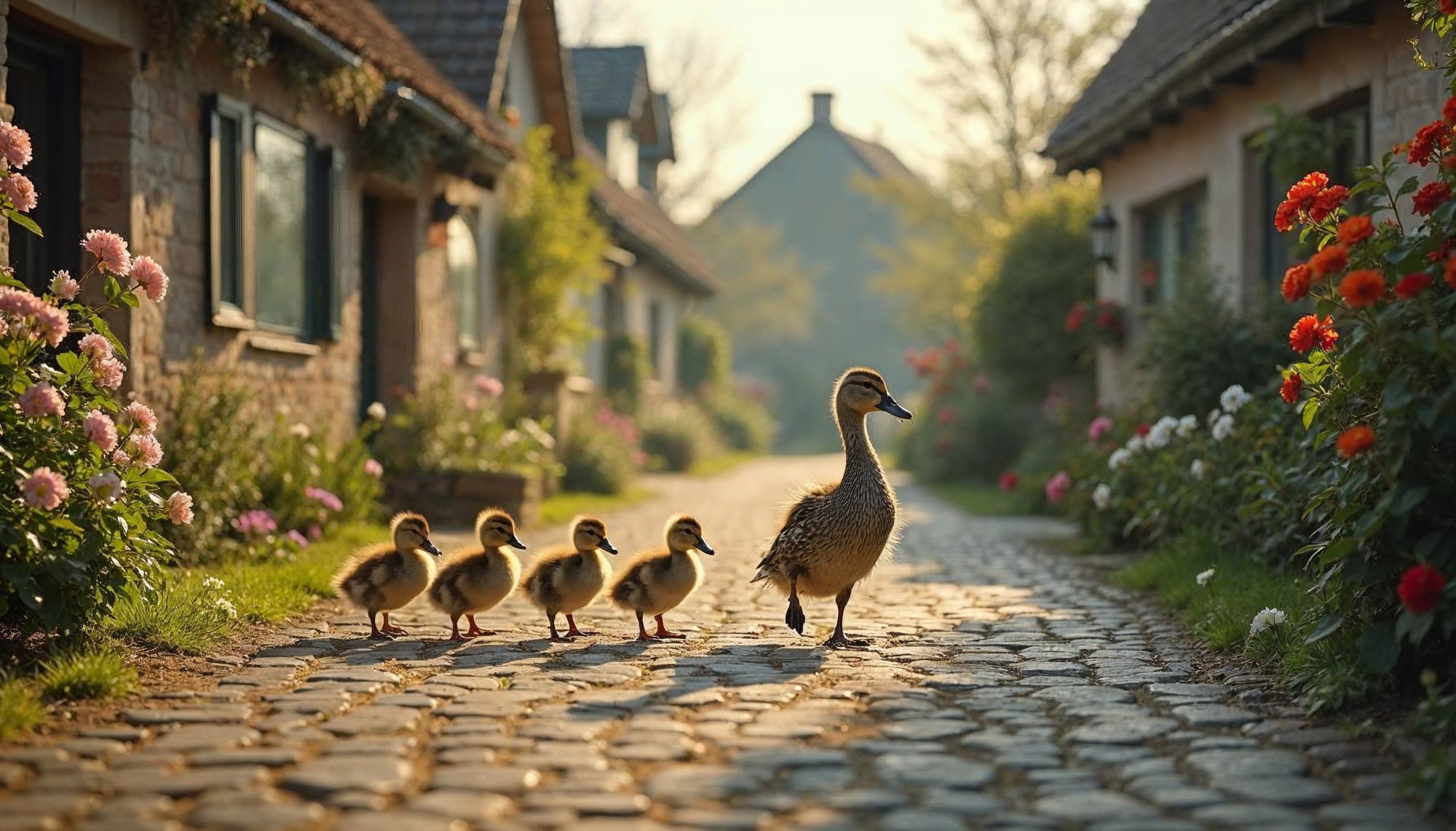 A mother duck walks confidently along a cobblestone path, guiding her ducklings past charming cottages and blooming flowers.