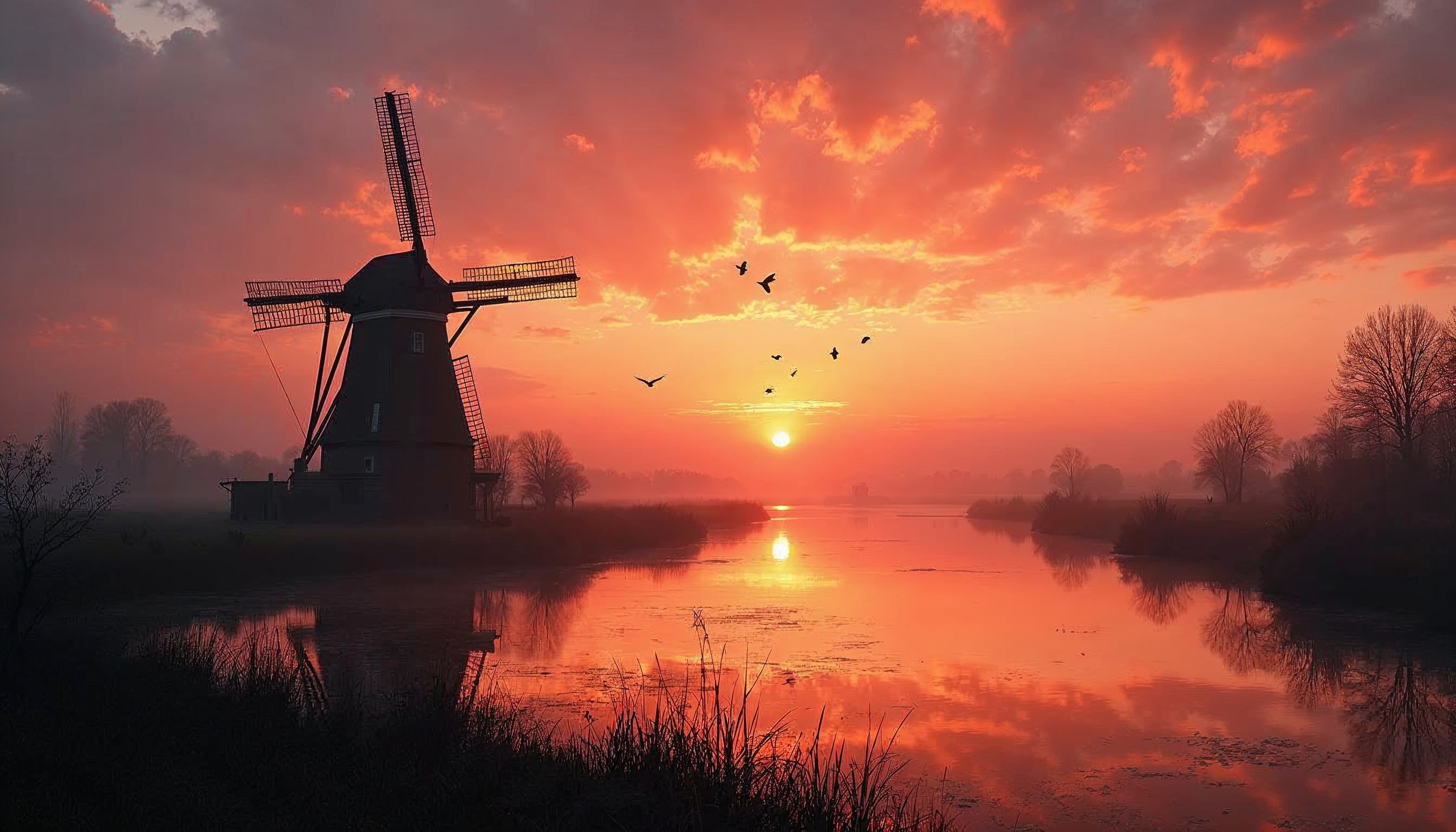 A tranquil sunset paints the sky orange and pink as a windmill stands silhouetted against the water. Birds soar gracefully by.