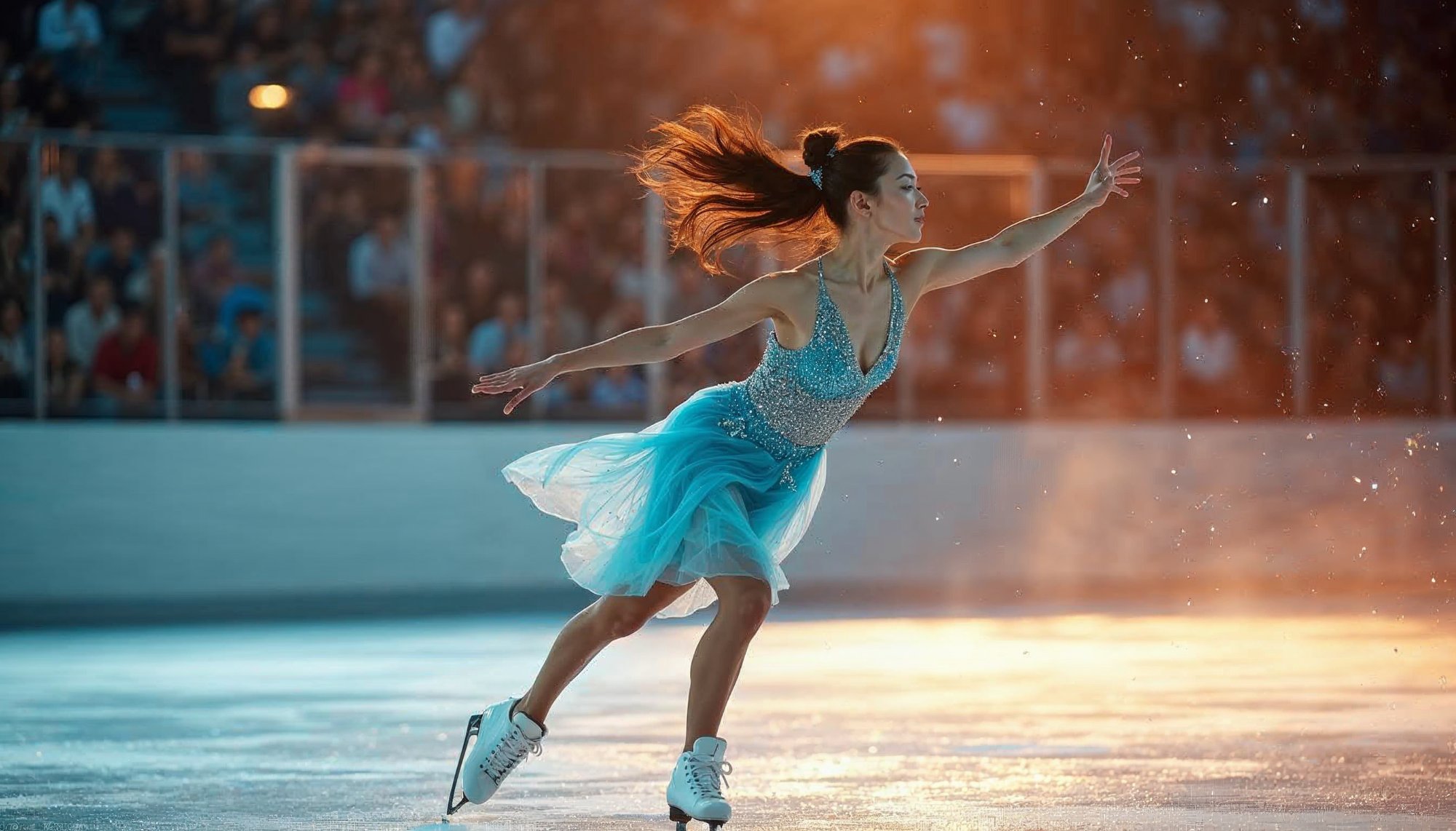 A talented skater glides gracefully across the ice, showcasing her skills in a shimmering blue dress while an audience watches in awe.
