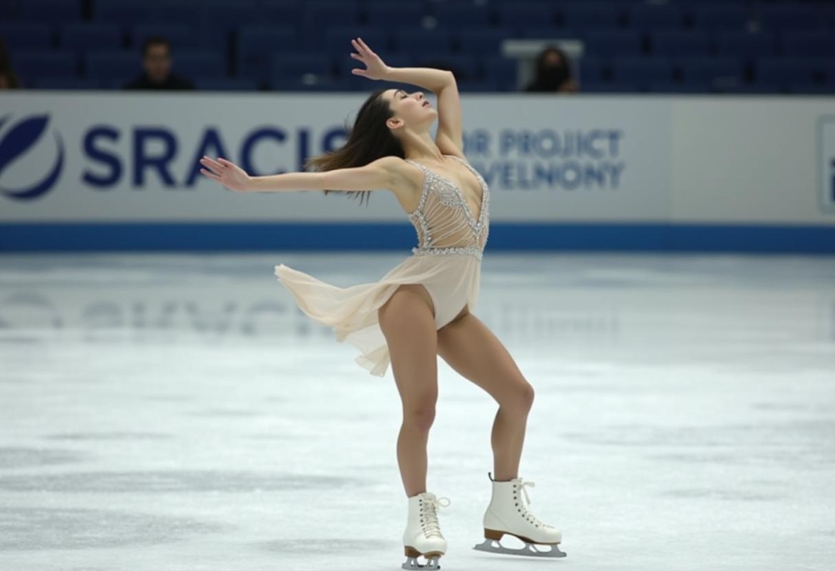 A figure skater shows elegance and skill while executing a routine on the ice rink during a competitive event in winter.