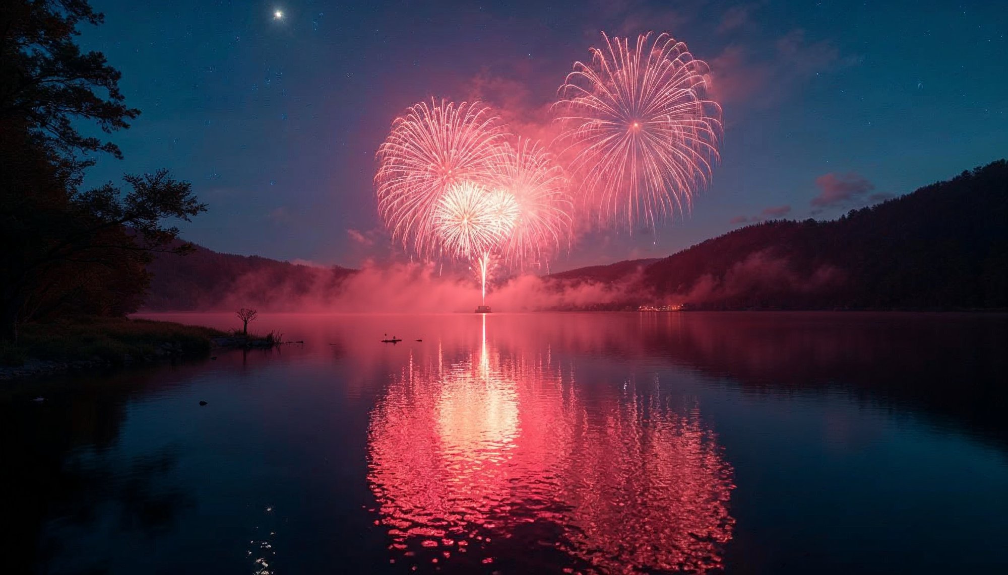 Fireworks illuminate the lake at dusk