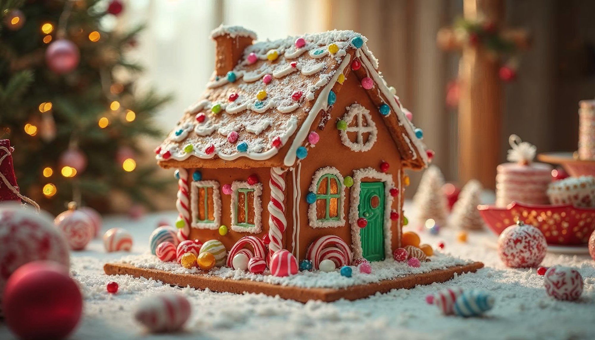 A charming gingerbread house adorned with colorful candies and icing sits on a snowy surface, surrounded by festive decorations.