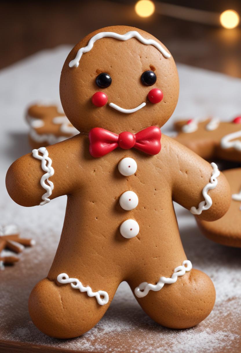 A cheerful gingerbread man with icing details poses on a festive table surrounded by holiday treats, evoking a warm, seasonal atmosphere.