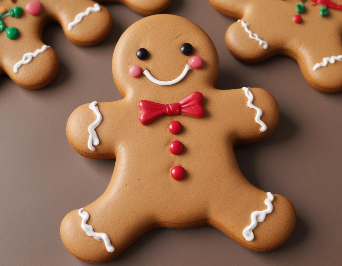 A gingerbread cookie shaped like a cheerful character features colorful icing decorations, perfect for holiday celebrations and festivities.