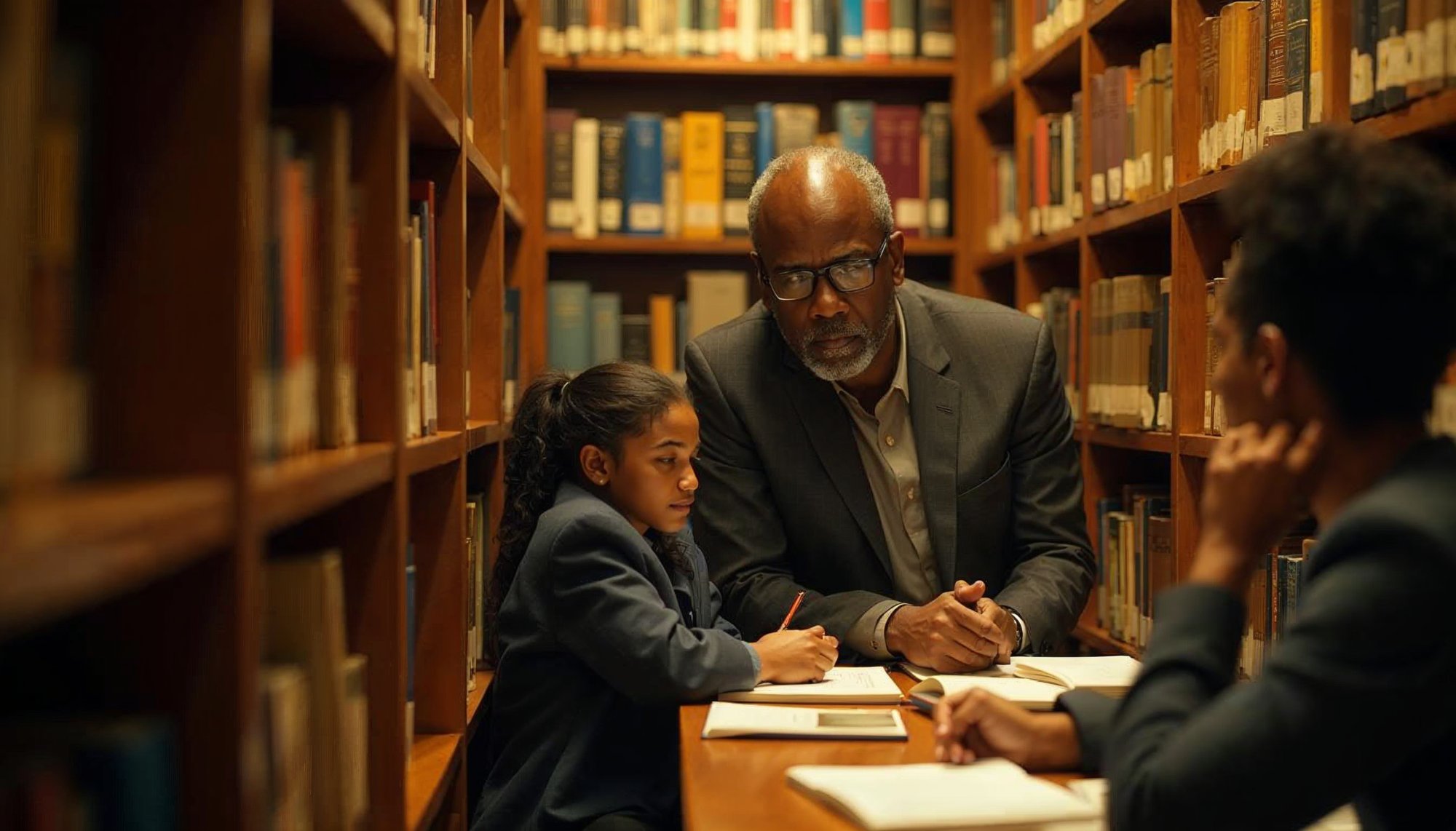 An elderly man helps a young girl with her studies while a woman listens attentively in a cozy library filled with books.