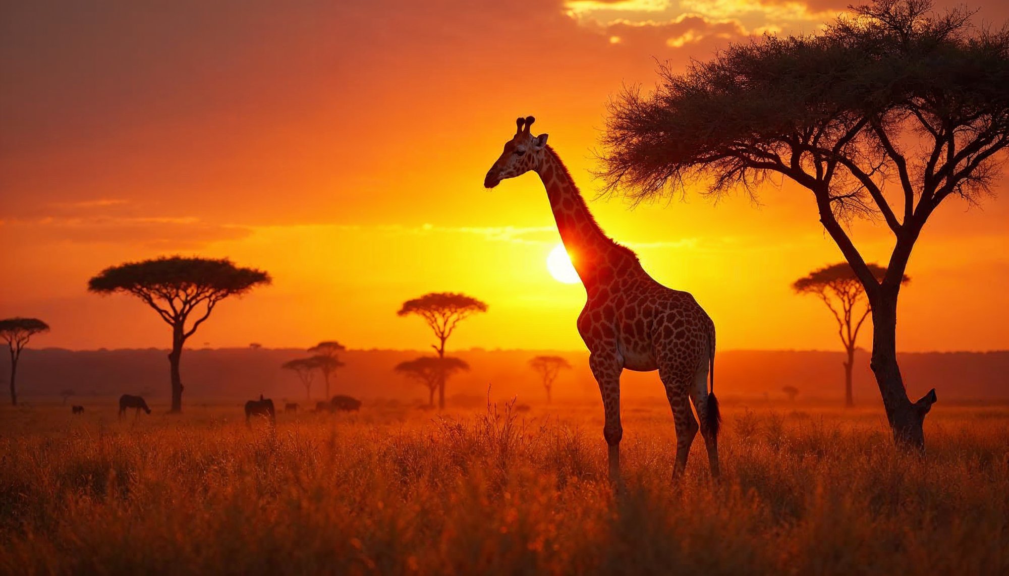 Africa, acacia trees, adventure, animals, colorful sky, ecosystem, evening, giraffe, grasslands, horizon, landscape, nature, outdoor, peaceful, savanna, serene, silhouette, sunset, tranquility, wildlife