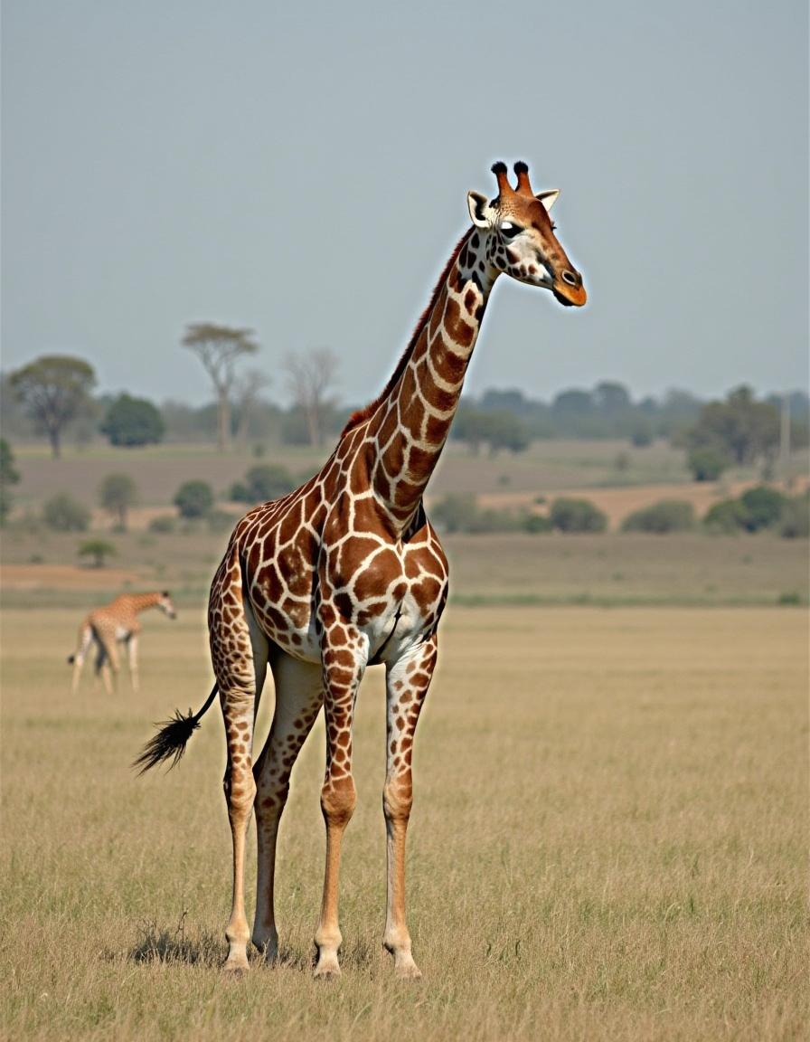 A giraffe stands gracefully in the savanna, surrounded by tall grass and a few distant acacia trees, showcasing its unique features.