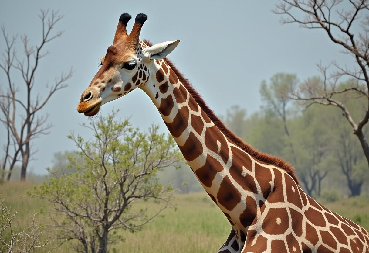 A giraffe stands gracefully among scattered trees, enjoying the warm sunlight in a vast savannah landscape, showcasing its unique patterns.