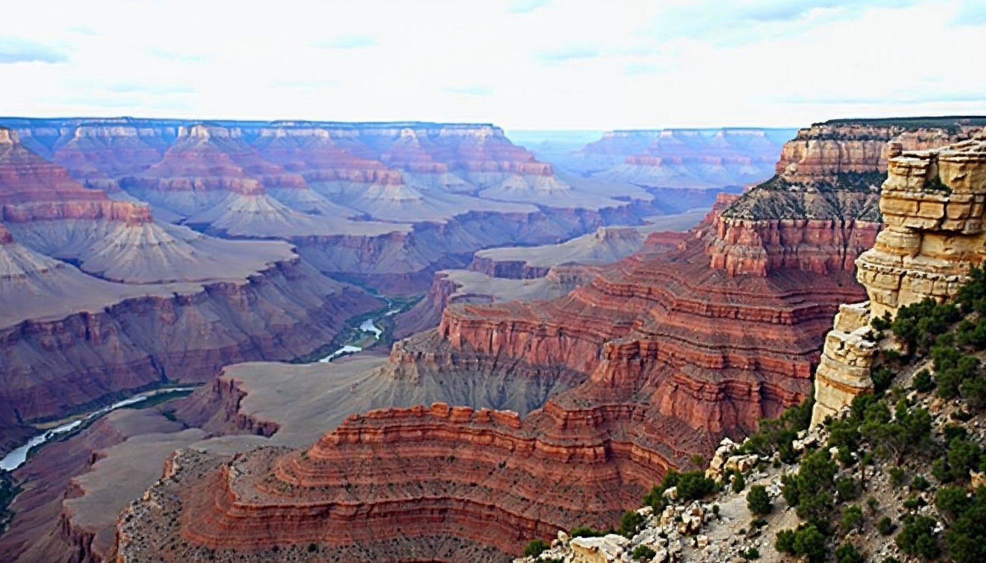 A stunning landscape reveals the layers of rock and canyon formations at the Grand Canyon, with a river winding through the valley below.