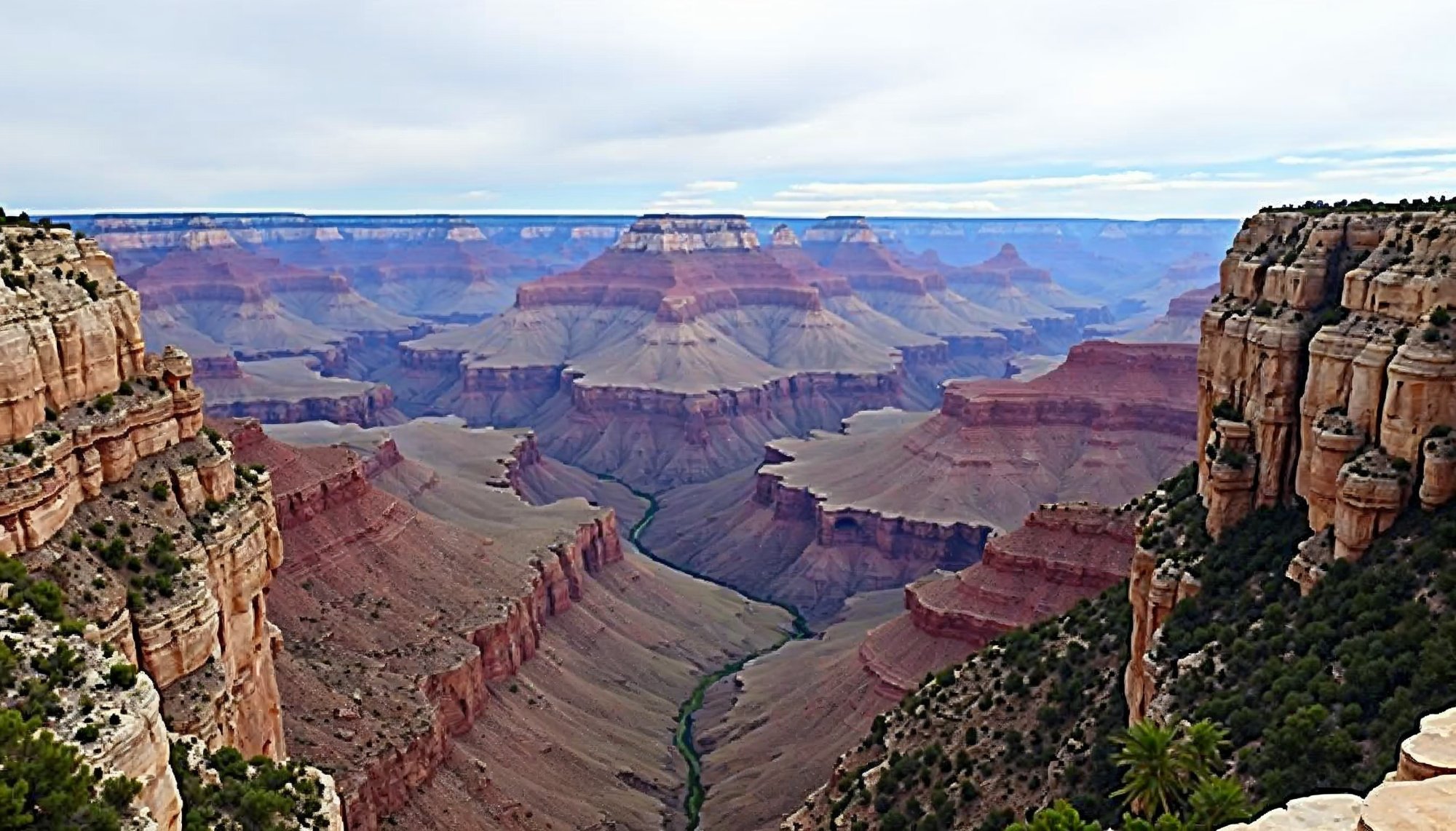 Breathtaking panorama of the Grand Canyon showcasing its layered rock formations and deep valley under cloudy skies during midday.