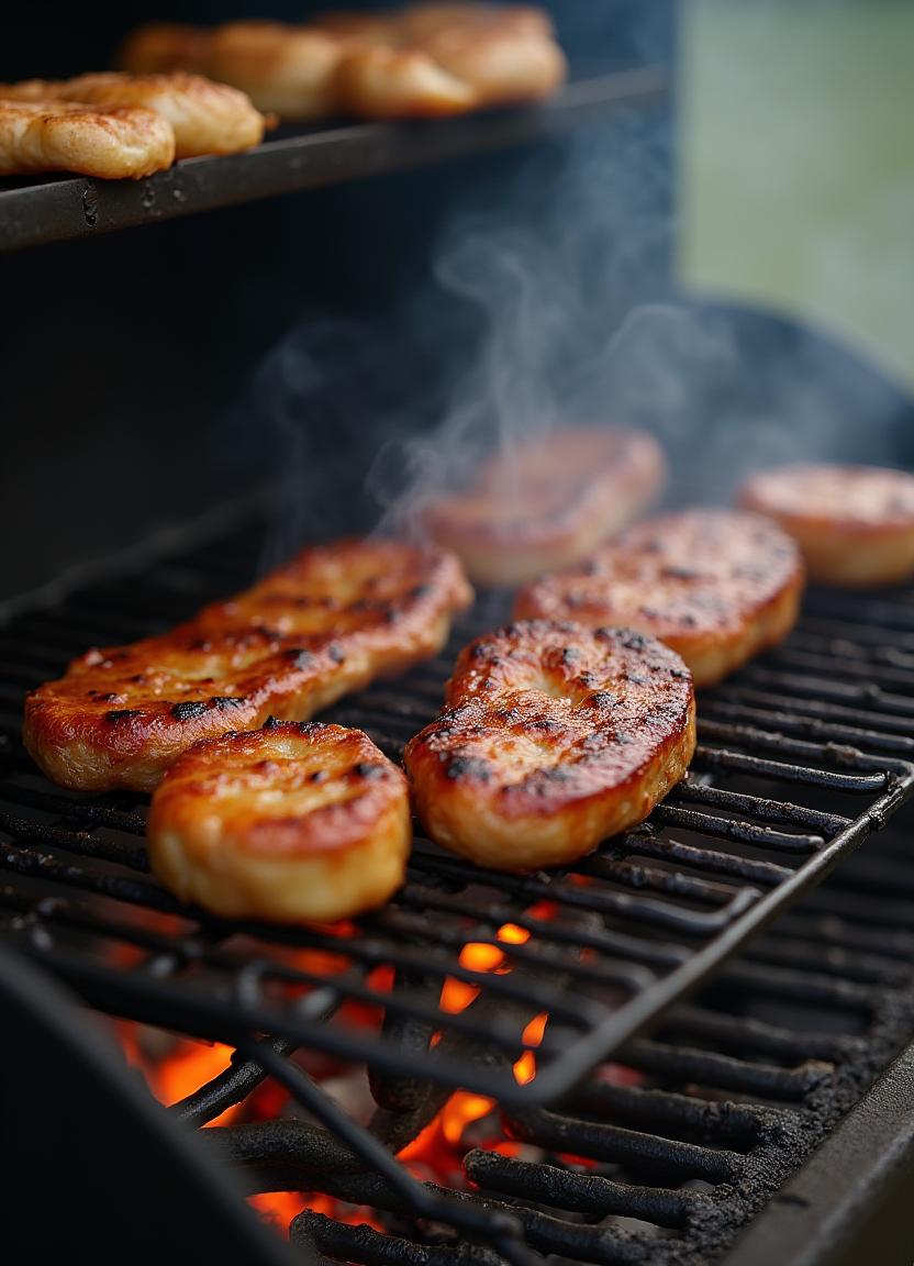 Juicy meat grilling over charcoal with smoke rising