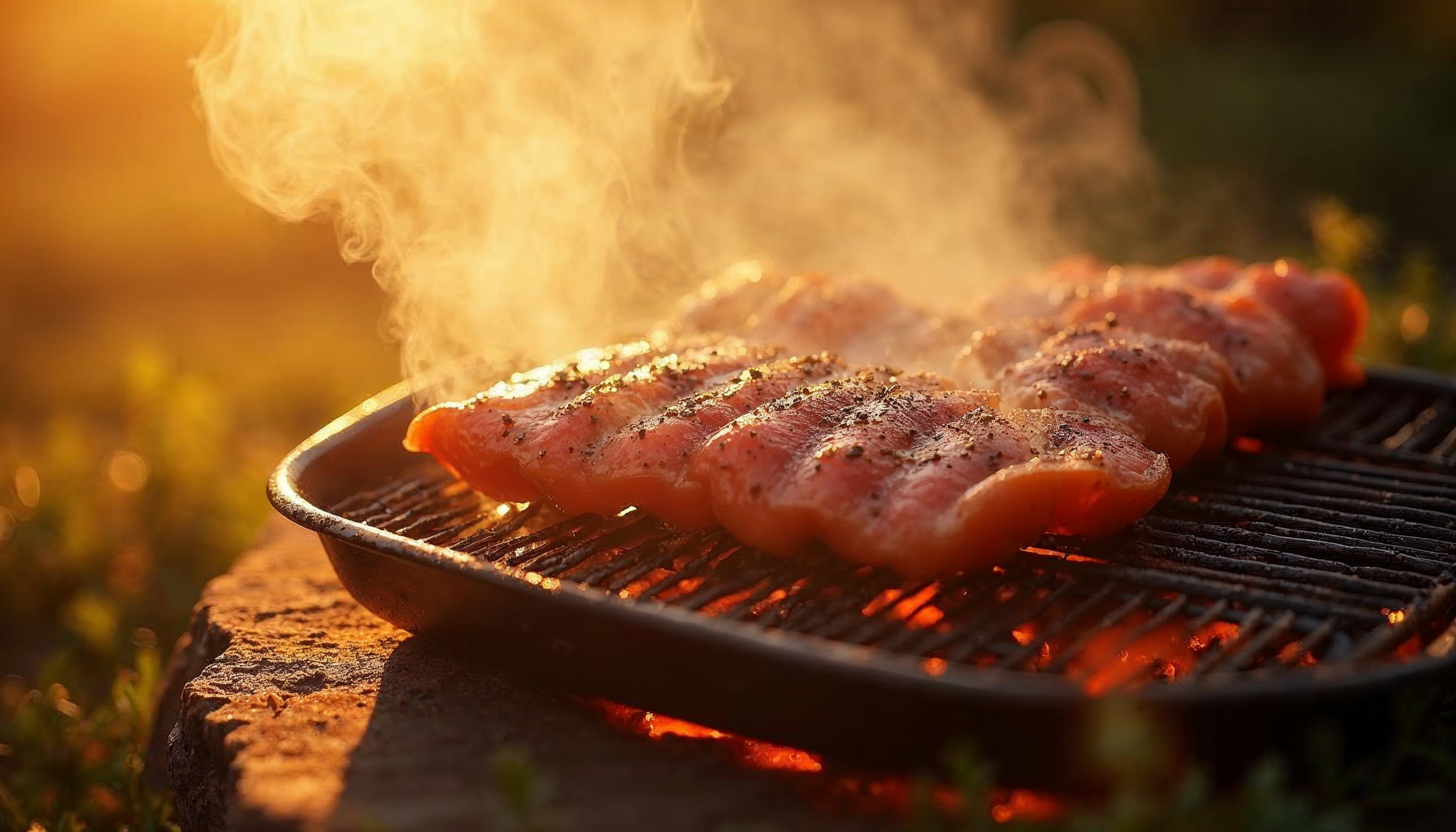 Fresh salmon fillets sizzle on a grill, emitting steam as the sun sets, creating a warm and inviting atmosphere in the backyard.