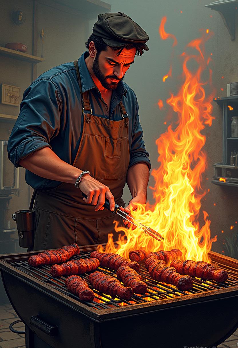 A chef skillfully grills sausages over an open flame in a busy kitchen, showcasing expertise and passion for cooking.